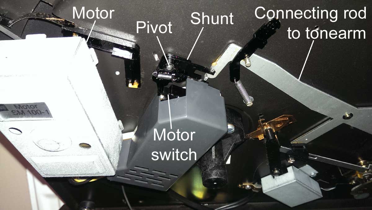 Answer: If the motor is not running at all, it is probably due to the microswitch beside the motor. This is a common issue on the CS505 as the switch and shunt can get sticky after a period of time. See our YouTube video tutorial https://youtu.be/tlEHLvlQ3Uw to see how to get inside the deck. SWITCH OFF THE POWER and open up the deck as per our video instructions. The photo above shows where the lever from the arm mechanism pushes the shunt and switch. A quick squirt of Servisol switch cleaner spray, WD40 or GT85 lubricating spray should sort it. While you're at it, it is a good idea to clean and lubricate the shunt pivot pin.